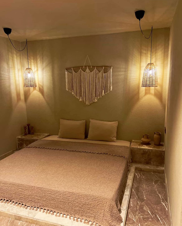 یه اتاق خواب با دوتا لپستر مکرومه که از دو طرف تخت آویزونه و یه دیوارکوب مکرومه ساده ولی در عین حال بسیار جذاب.