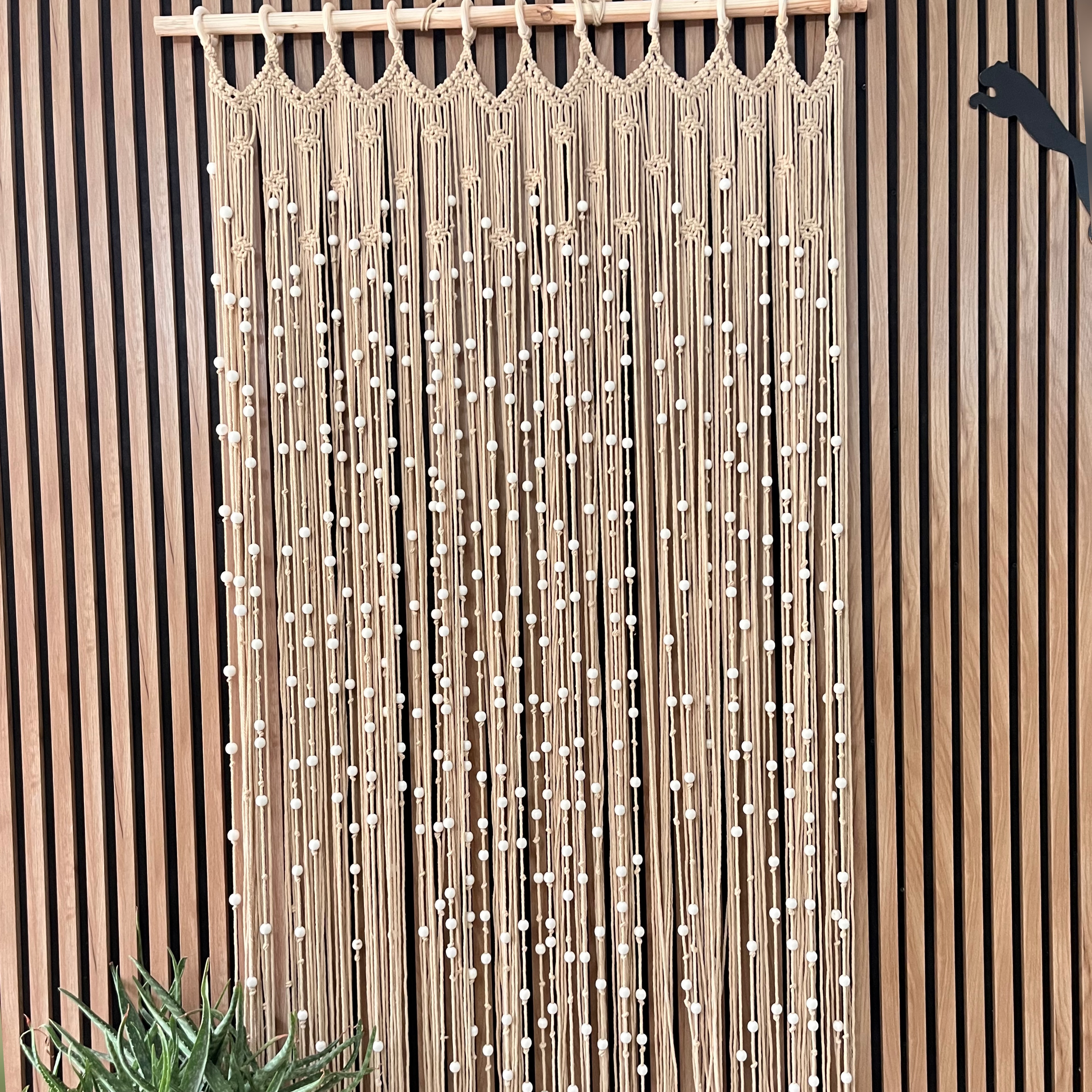 این پرده مکرومه رنگ نسکافه ای بافت اقتصادی ولی ترکیب شده با مهره های چوبی که از دل طبیعت و جنگل بوجود اومده
