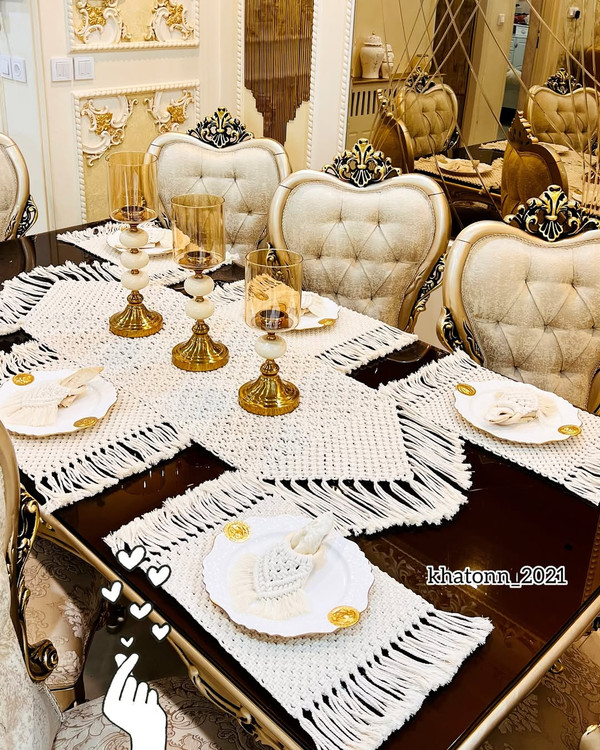 این ست شامل یک رانر وسط و ۶عدد زیر بشقابی مکرومه رنگ شیری میباشد