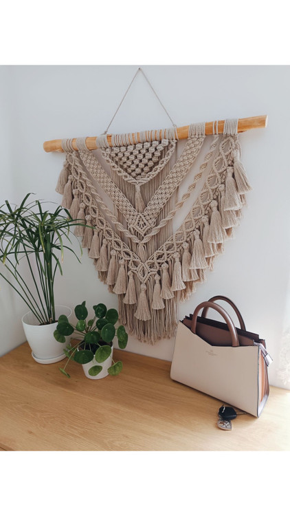 دیوارکوب فندقی برنگ شیری از بهترین نوع نخ و دارای تعداد زیادی منگوله یه طرح مینیمال ولی پر کار